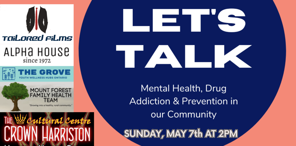 LET'S TALK! Mental Health, Drug Addiction & Prevention in our Community. An interactive discussion and film screening hosted by filmmaker and drug awareness advocate Chad Tailor. With partners from The Mount Forest Family Health Team, The Grove Youth Hub, and AlphaHouse.